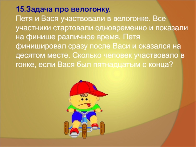 стартовали одновременно и показали на финише различное время. Петя финишировал сразу после Васи и оказался на десятом месте. Сколько человек участвовало в гонке, если Вася был пятнадцатым с конца?