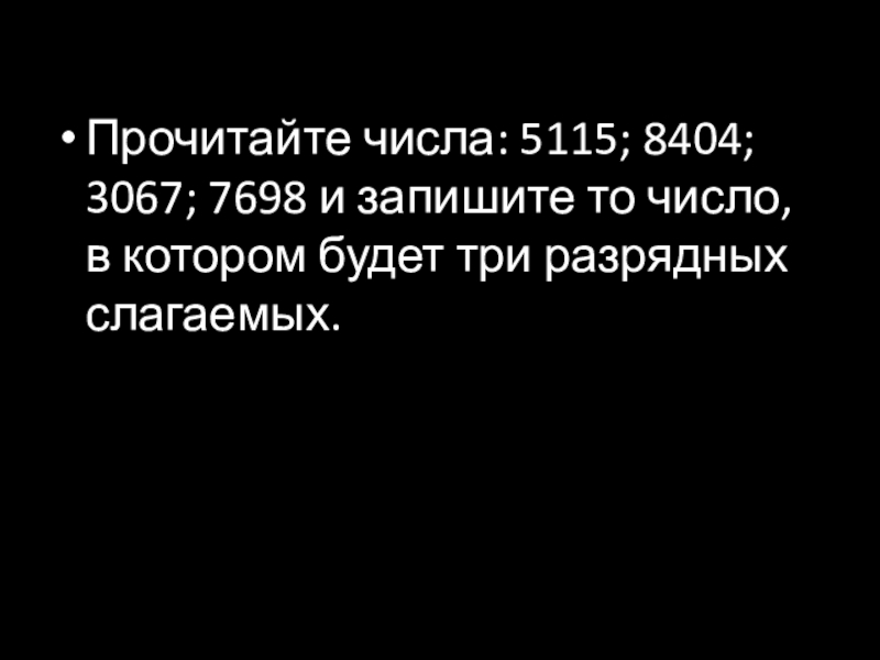 Прочитайте числа: 5115; 8404; 3067; 7698 и запишите то число, в котором будет три разрядных слагаемых.
