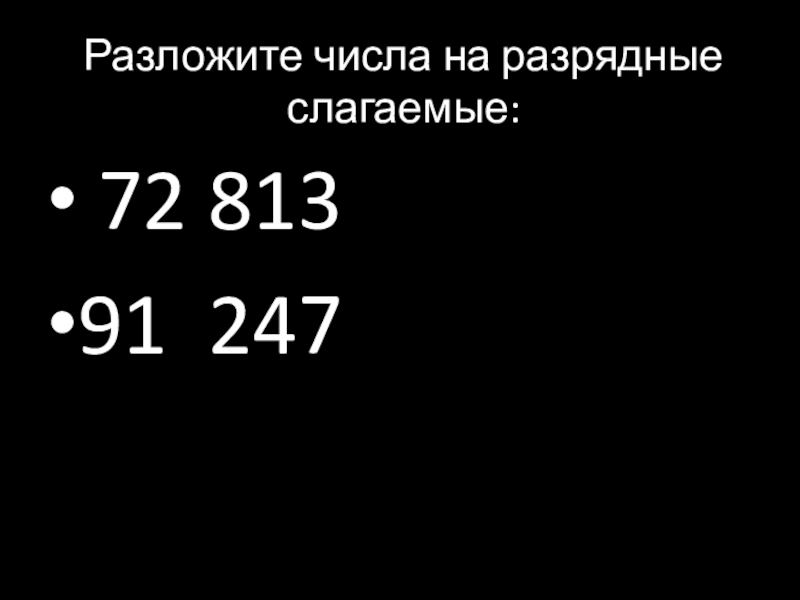 Разложите числа на разрядные слагаемые:  72 81391 247