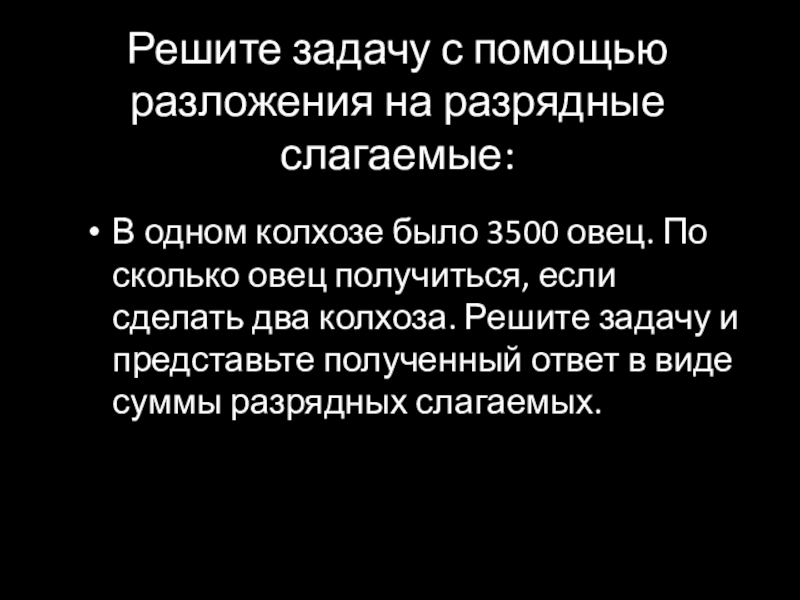 Решите задачу с помощью разложения на разрядные слагаемые:В одном колхозе было 3500 овец. По сколько овец получиться,