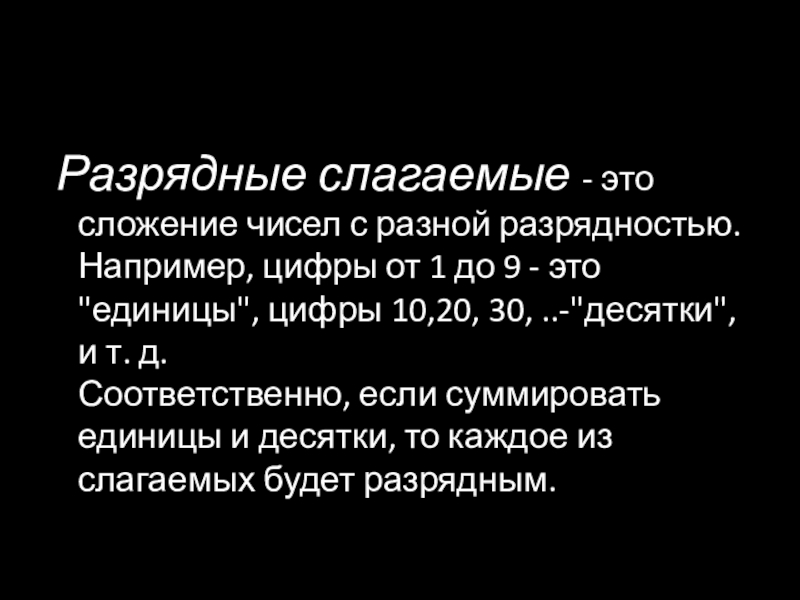 Разрядные слагаемые - это сложение чисел с разной разрядностью.  Например, цифры от 1 до 9 -