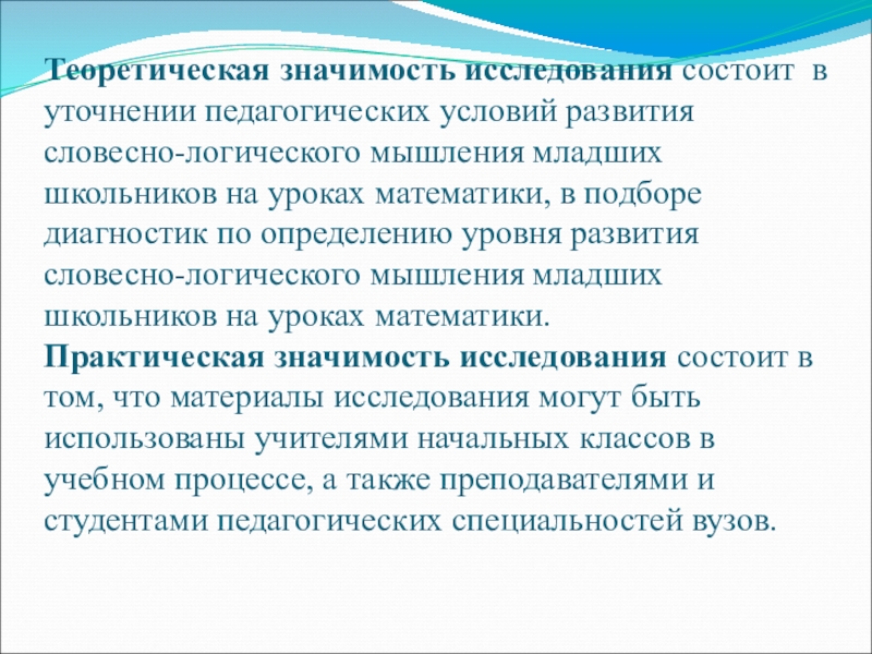 Слайд 9Теоретическая значимость исследования состоит в уточнении педагогических условий развития словесно-логического мышления