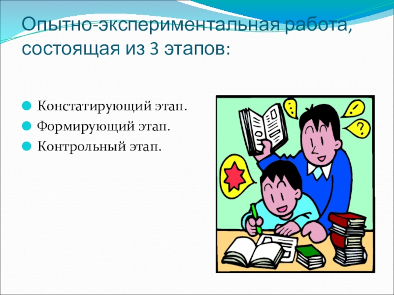 Слайд 15Опытно-экспериментальная работа, состоящая из 3 этапов: