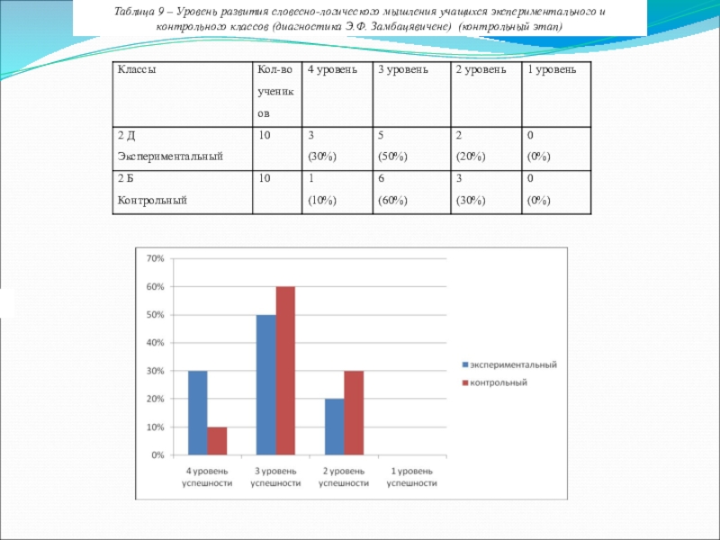 Слайд 19Таблица 9 – Уровень развития словесно-логического мышления учащихся экспериментального и контрольного