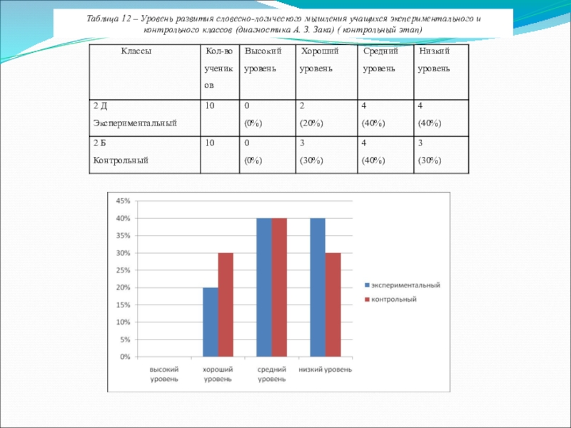 Слайд 20Таблица 12 – Уровень развития словесно-логического мышления учащихся экспериментального и контрольного