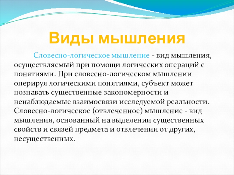 осуществляемый при помощи логических операций с понятиями. При словесно-логическом мышлении оперируя логическими понятиями, субъект может познавать существенные закономерности и ненаблюдаемые взаимосвязи исследуемой реальности. Словесно-логическое (отвлеченное) мышление - вид мышления, основанный на выделении существенных свойств и связей предмета и отвлечении от других, несущественных.