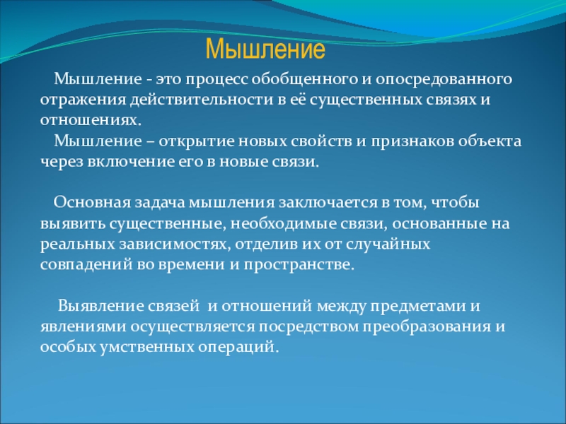 Основная задача мышления заключается в том, чтобы выявить существенные, необходимые связи, основанные на реальных зависимостях, отделив их от случайных совпадений во времени и пространстве.