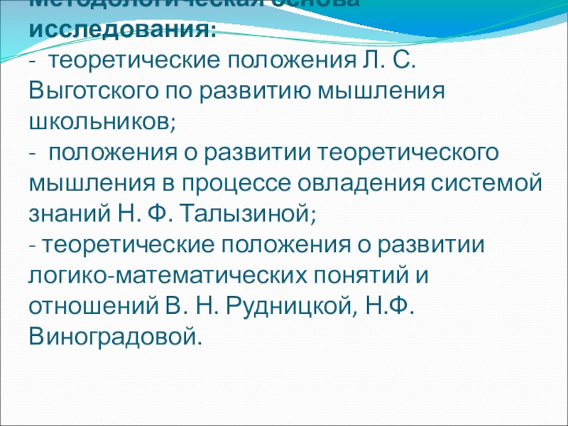 - положения о развитии теоретического мышления в процессе овладения системой знаний Н. Ф. Талызиной;