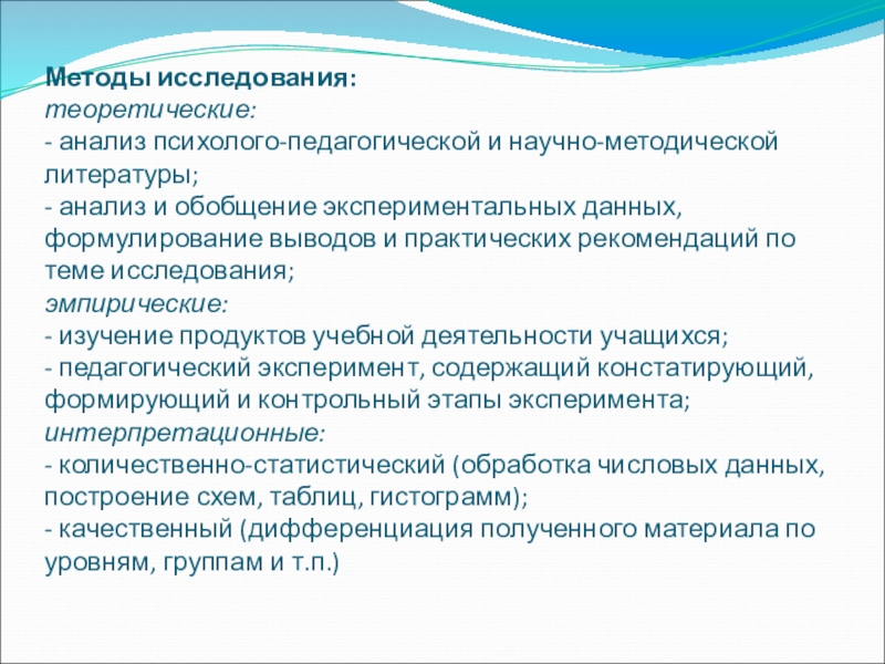 - педагогический эксперимент, содержащий констатирующий, формирующий и контрольный этапы эксперимента;