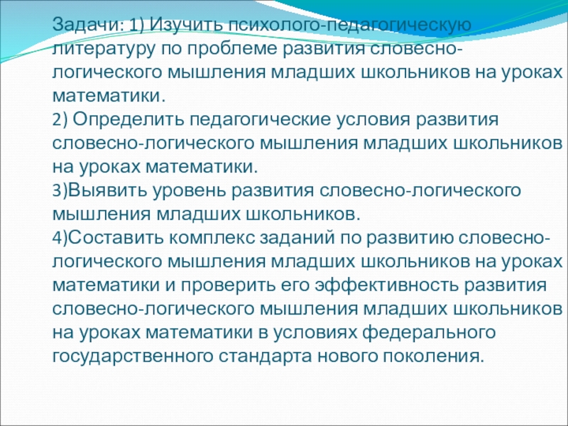 Задачи: 1) Изучить психолого-педагогическую литературу по проблеме развития словесно-логического мышления младших