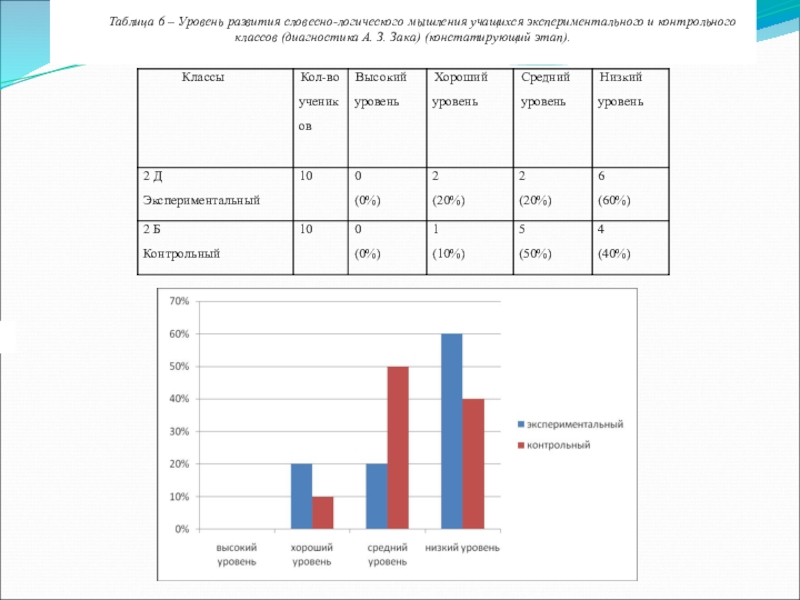 Слайд 18Таблица 6 – Уровень развития словесно-логического мышления учащихся экспериментального и контрольного