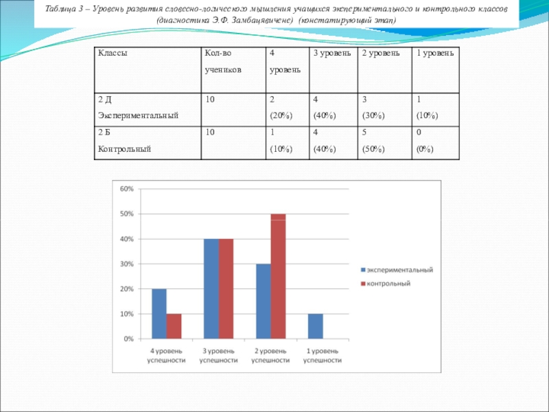 Слайд 17Таблица 3 – Уровень развития словесно-логического мышления учащихся экспериментального и контрольного