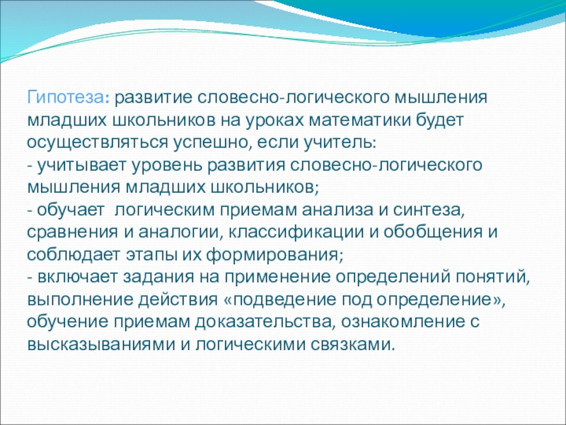 Слайд 4Гипотеза: развитие словесно-логического мышления младших школьников на уроках математики будет осуществляться