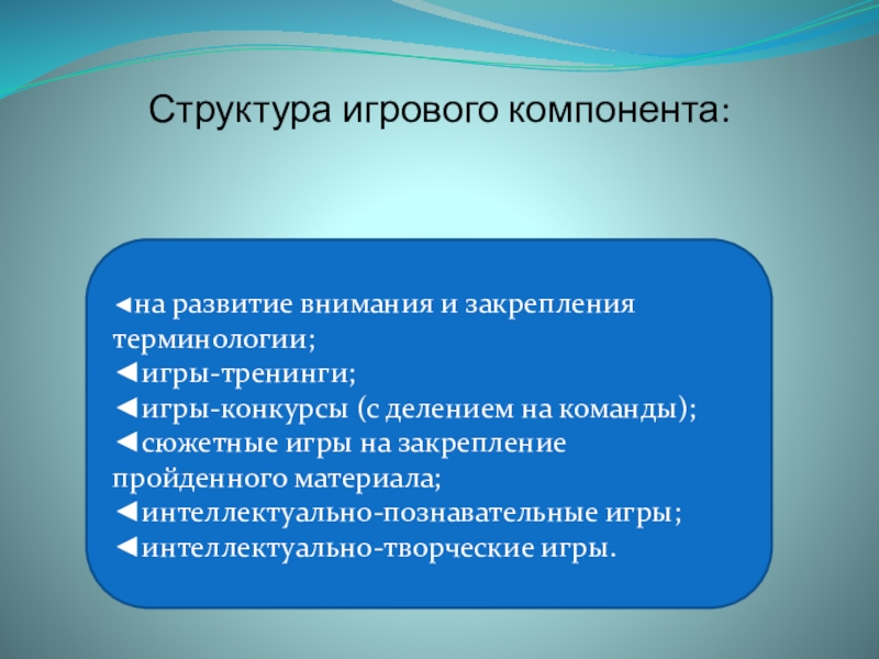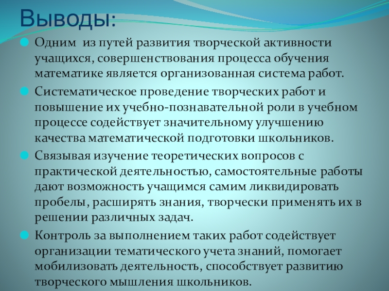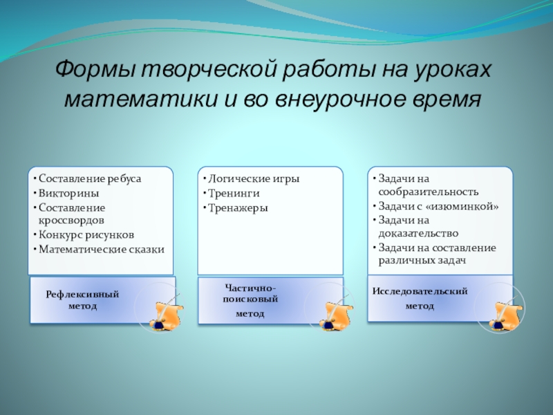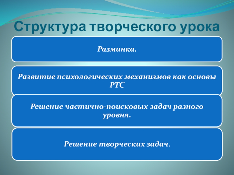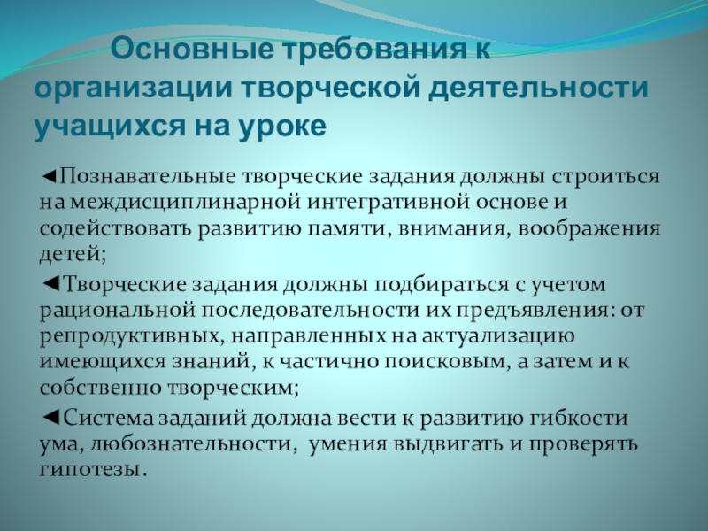 ◄Творческие задания должны подбираться с учетом рациональной последовательности их предъявления: от репродуктивных, направленных на актуализацию имеющихся знаний, к частично поисковым, а затем и к собственно творческим;