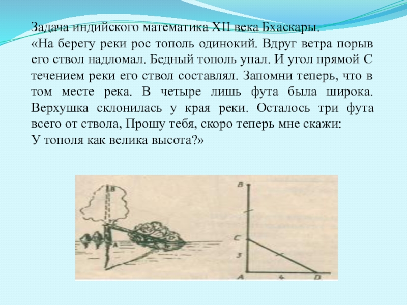 Вдруг ветра порыв его ствол надломал. Бедный тополь упал. И угол прямой С течением реки его ствол составлял. Запомни теперь, что в том месте река. В четыре лишь фута была широка. Верхушка склонилась у края реки. Осталось три фута всего от ствола, Прошу тебя, скоро теперь мне скажи: