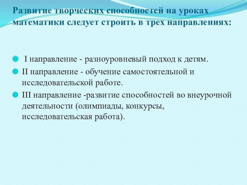 Слайд 5Развитие творческих способностей на уроках математики следует строить в трех направлениях: