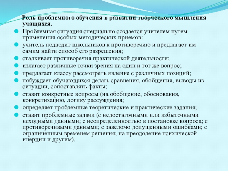 Слайд 6 Роль проблемного обучения в развитии творческого мышления учащихся.