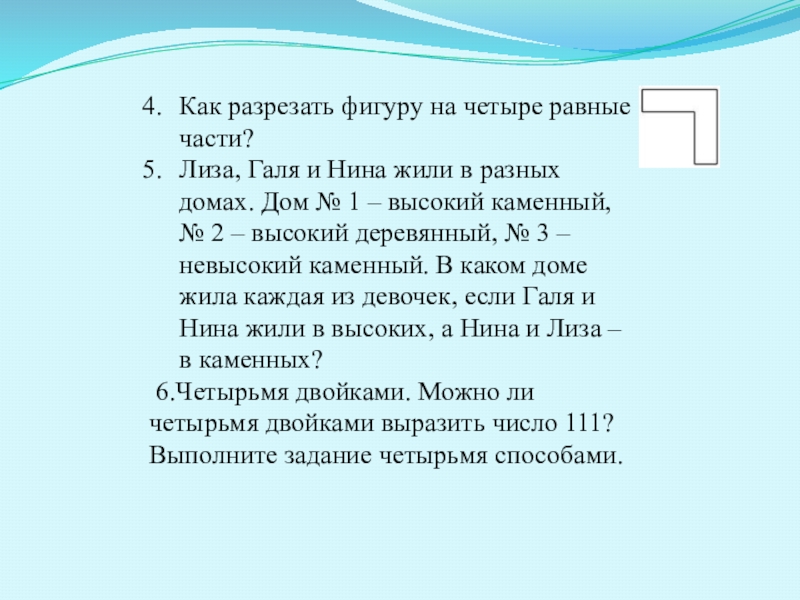 Слайд 8Как разрезать фигуру на четыре равные части?