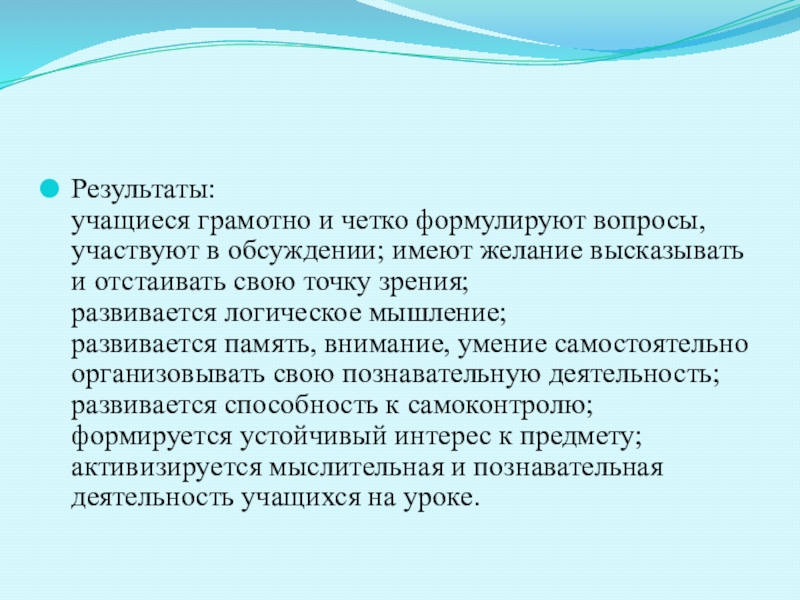 учащиеся грамотно и четко формулируют вопросы, участвуют в обсуждении; имеют желание