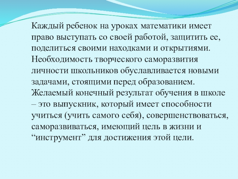 Слайд 12Каждый ребенок на уроках математики имеет право выступать со своей работой,