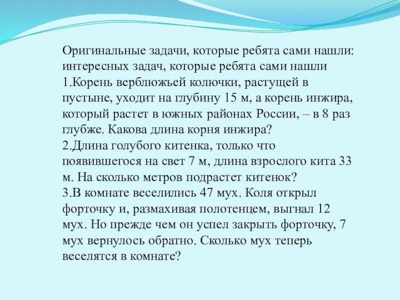 Слайд 7Оригинальные задачи, которые ребята сами нашли:
