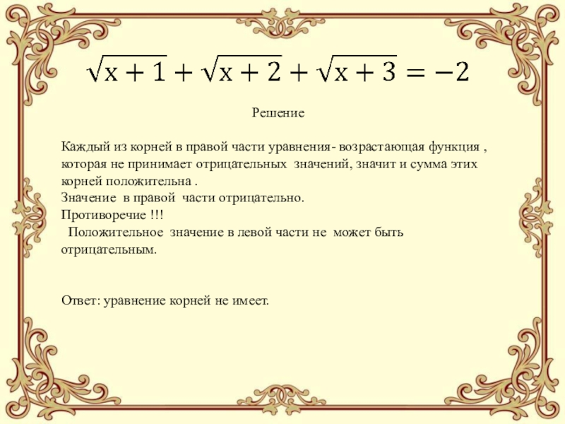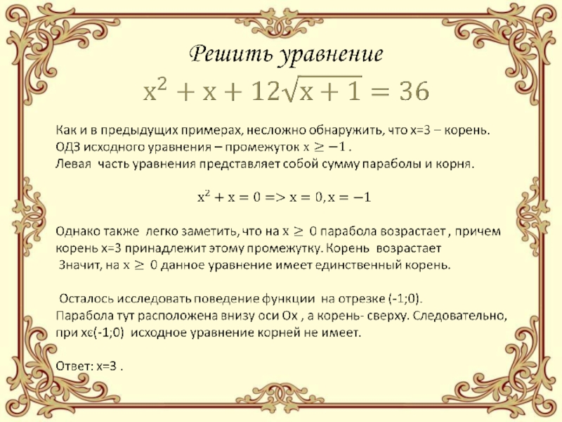 Презентация, доклад на тему Решение иррациональных уравнений с использованием свойств входящих в них функций