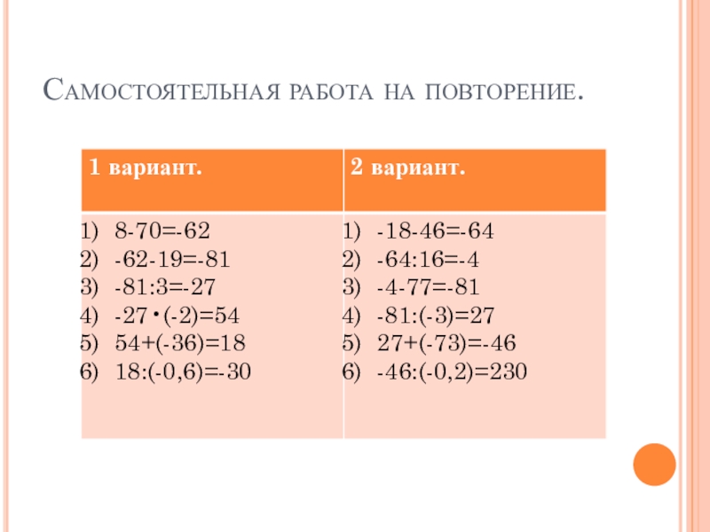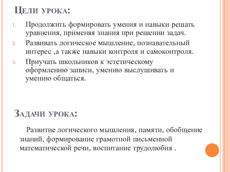 Развитие логического мышления, памяти, обобщение знаний, формирование грамотной письменной математической речи, воспитание трудолюбия .