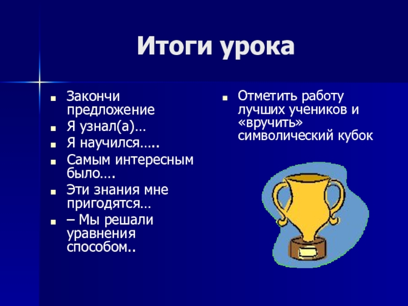 Отметить работу лучших учеников и «вручить» символический кубок