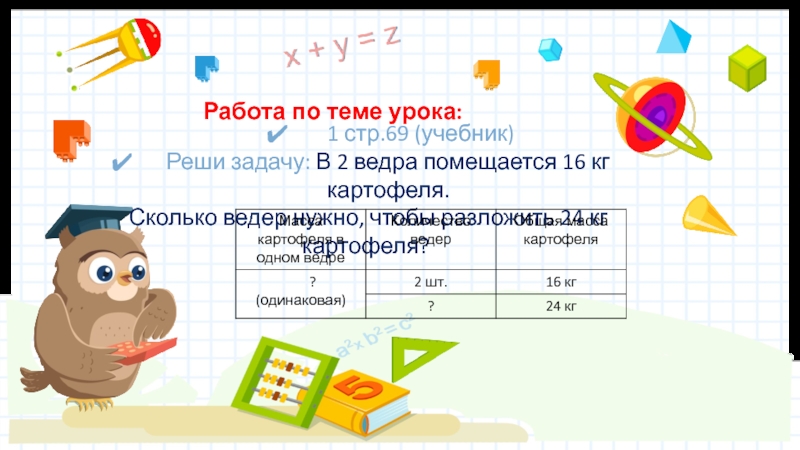 Работа по теме урока:  1 стр.69 (учебник)Реши задачу: В 2 ведра помещается 16 кг картофеля. Сколько