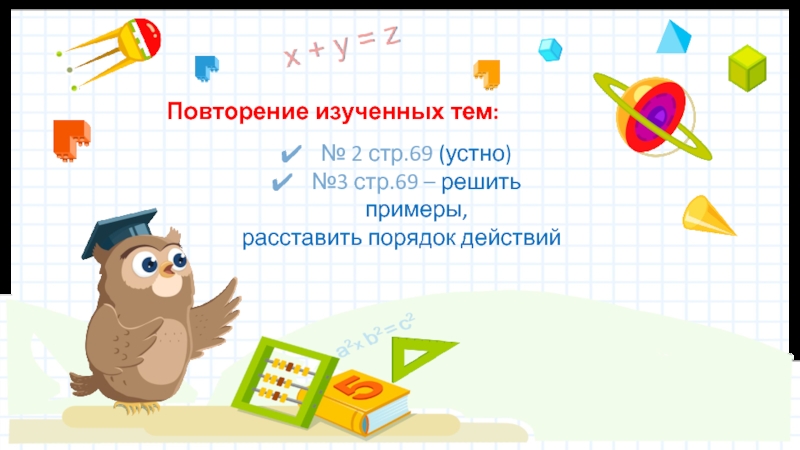 Повторение изученных тем: № 2 стр.69 (устно)№3 стр.69 – решить примеры,расставить порядок действий