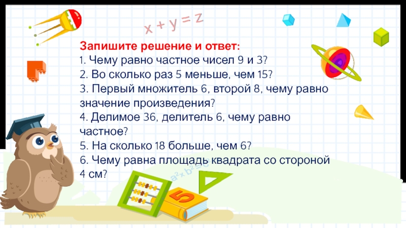 Слайд 2 Запишите решение и ответ: 1. Чему равно частное чисел 9 и 3? 2.