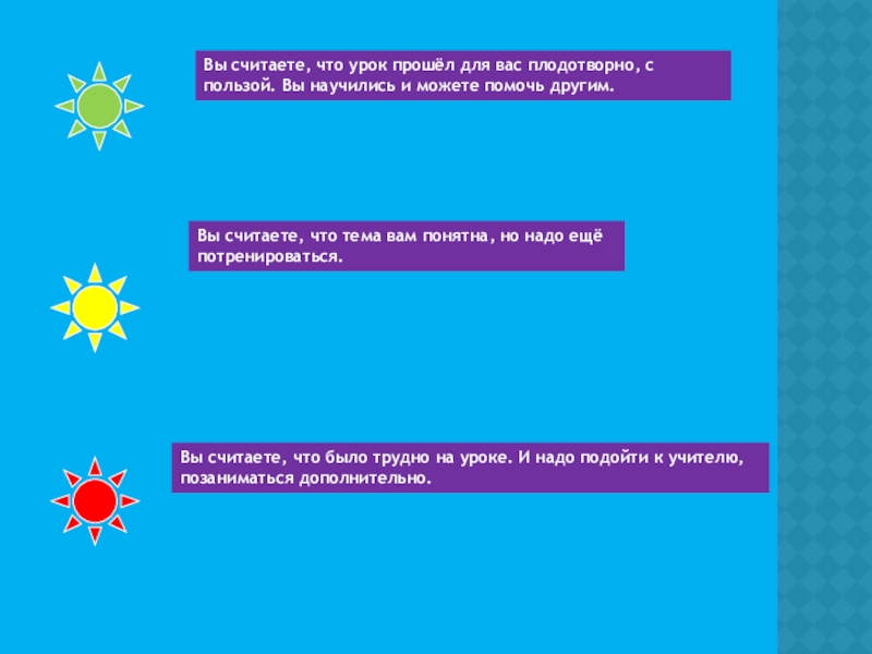 Вы считаете, что урок прошёл для вас плодотворно, с пользой. Вы научились и можете помочь другим.