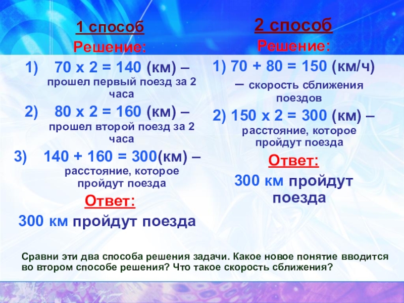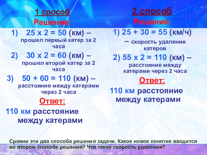Сравни эти два способа решения задачи. Какое новое понятие вводится во втором способе решения? Что такое скорость сближения?