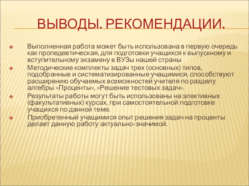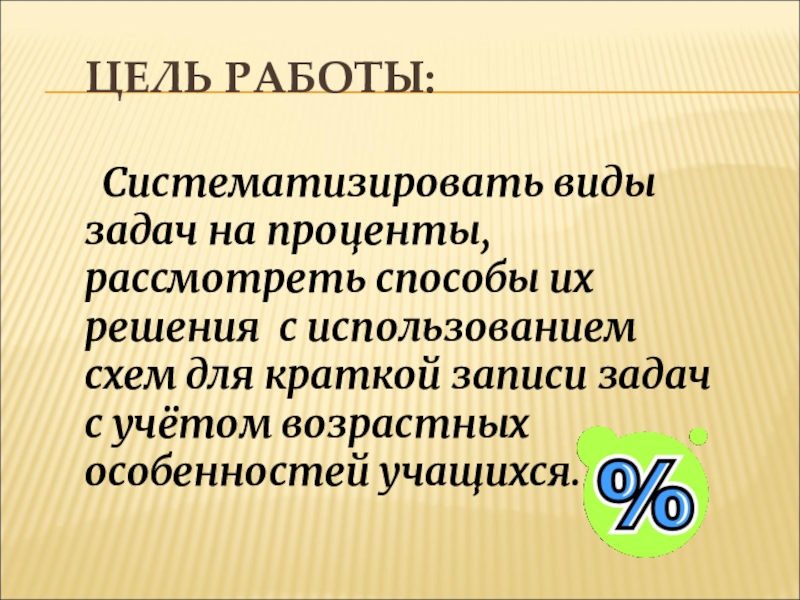 Приобретенный учащимися опыт решения задач на проценты делает данную работу актуально-значимой.