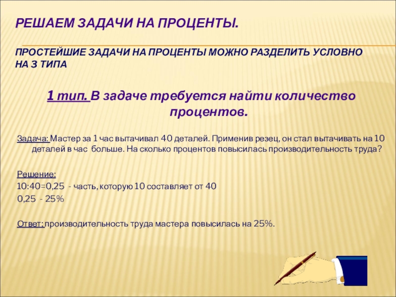 Задача: Мастер за 1 час вытачивал 40 деталей. Применив резец, он стал вытачивать на 10 деталей в час больше. На сколько процентов повысилась производительность труда?