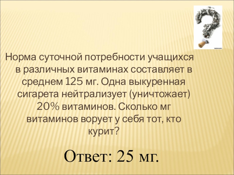 мг. Одна выкуренная сигарета нейтрализует (уничтожает) 20% витаминов. Сколько мг витаминов ворует у себя тот, кто курит?