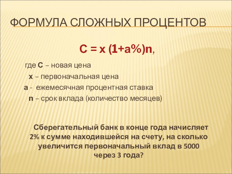 Слайд 23ФОРМУЛА СЛОЖНЫХ ПРОЦЕНТОВ