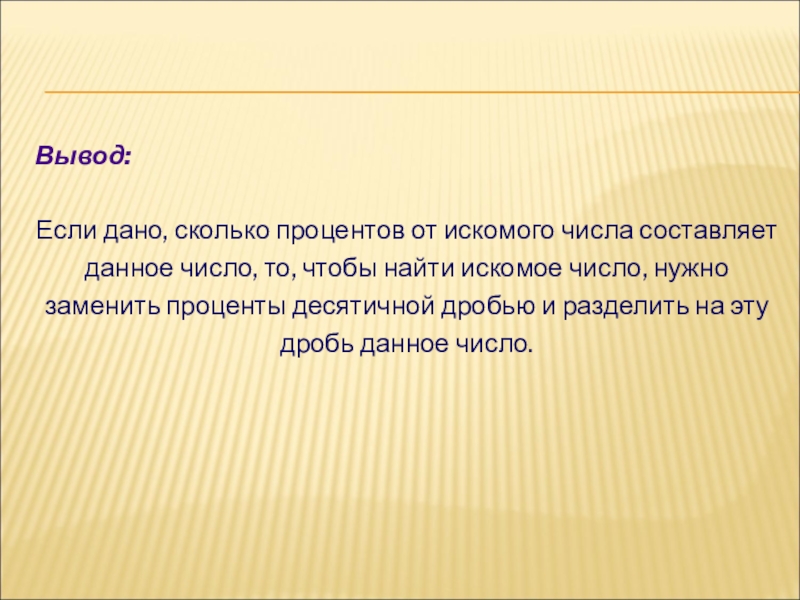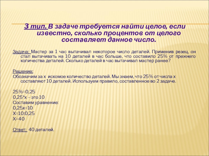 Слайд 203 тип. В задаче требуется найти целое, если известно, сколько процентов