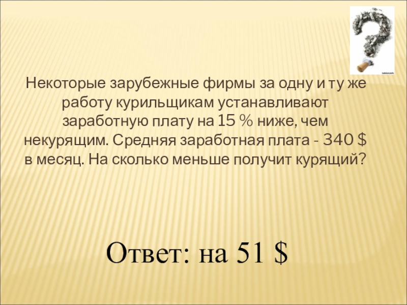 работу курильщикам устанавливают заработную плату на 15 % ниже, чем некурящим. Средняя заработная плата - 340 $ в месяц. На сколько меньше получит курящий?