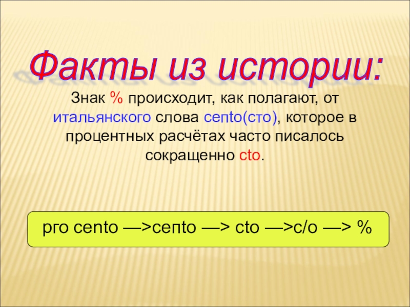 Слайд 8Знак % происходит, как полагают, от итальянского слова сепtо(сто), которое в