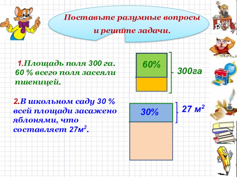 2.В школьном саду 30 % всей площади засажено яблонями, что составляет 27м2.