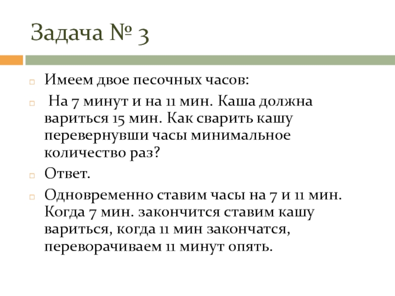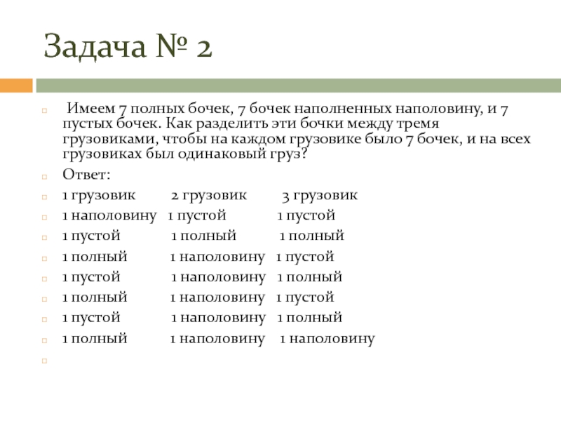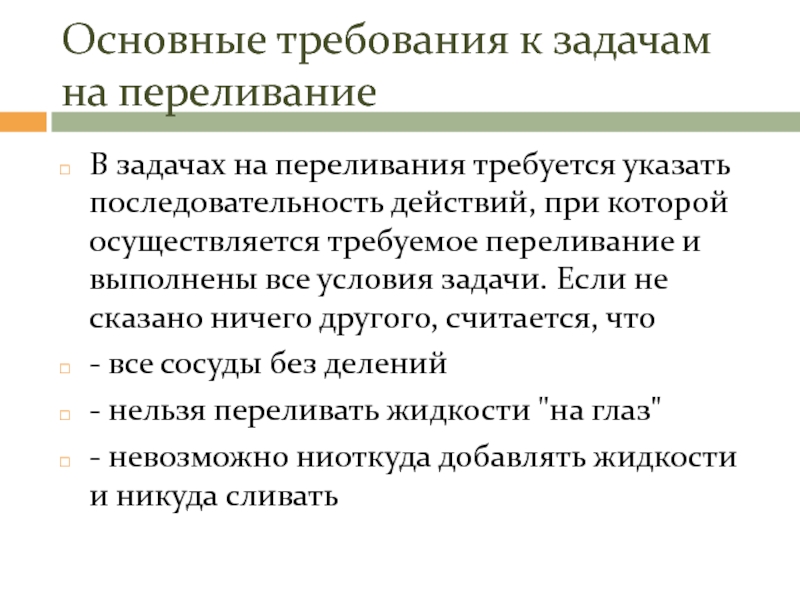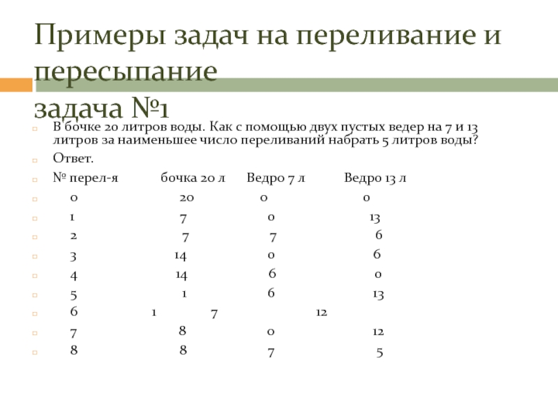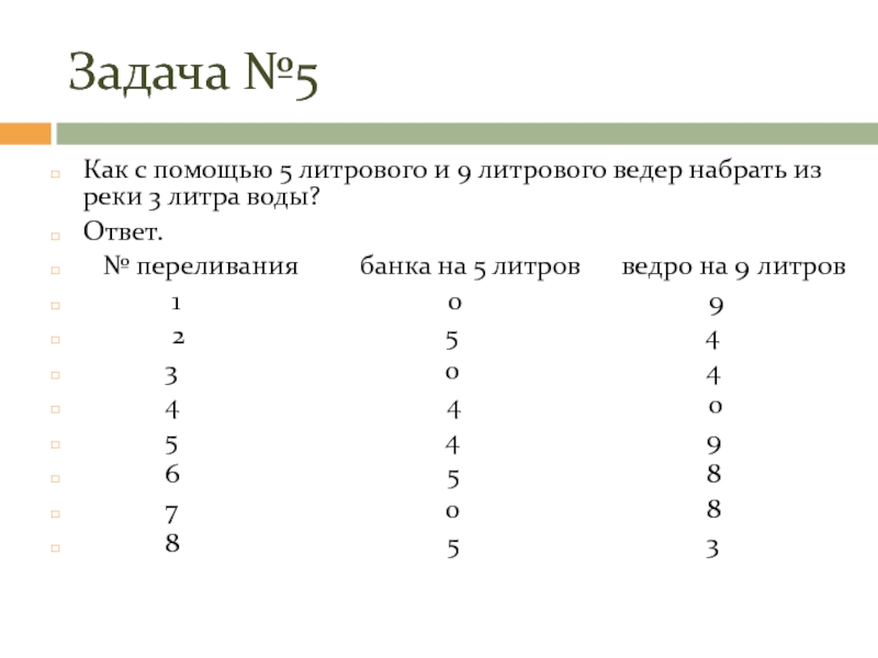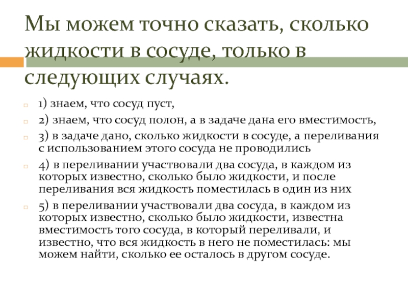 3) в задаче дано, сколько жидкости в сосуде, а переливания с использованием этого сосуда не проводились