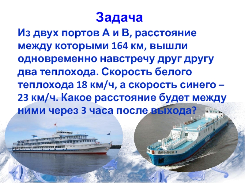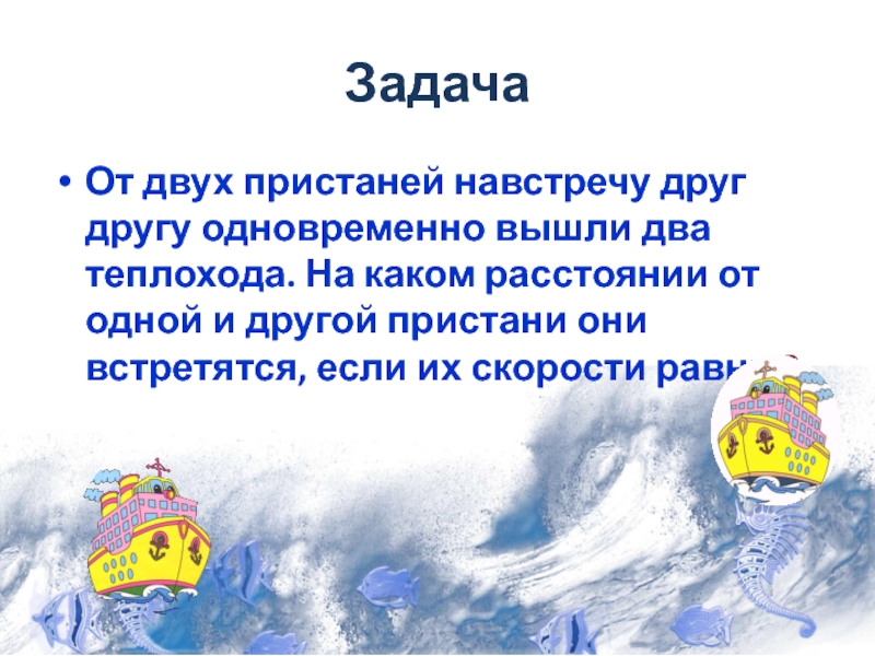 Если теплоходы вышли одновременно и проходили в час одинаковое расстояние, то они встретятся на середине пути или на одинаковом расстоянии от одной и другой пристани.