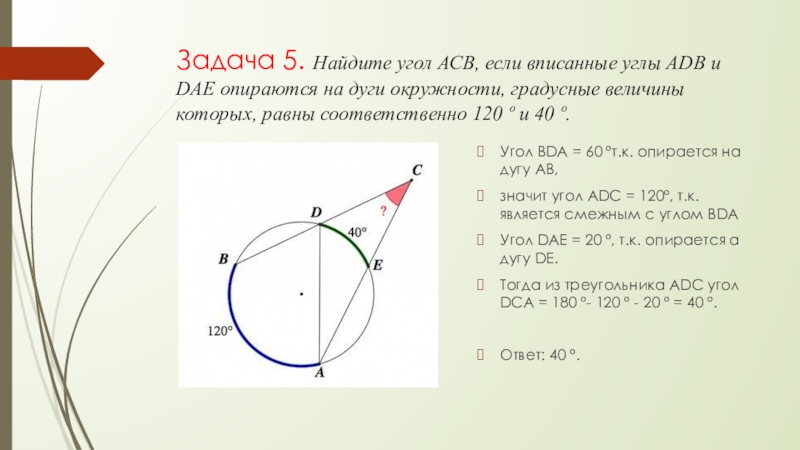 Тогда из треугольника ADC угол DСA = 180 º- 120 º - 20 º = 40 º.