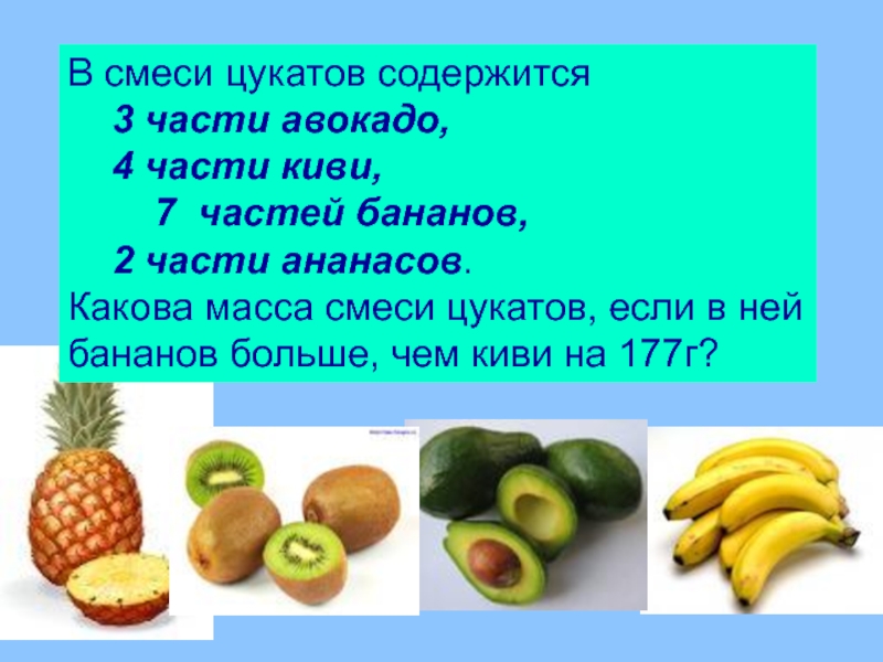Так как бананов больше, чем киви на 177 г, составим и решим уравнение :