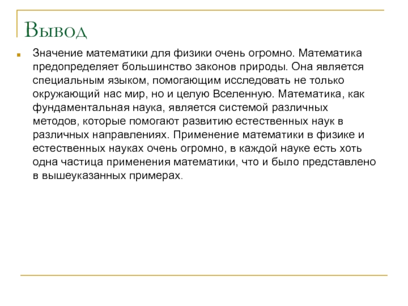 Она является специальным языком, помогающим исследовать не только окружающий нас мир, но и целую Вселенную. Математика, как фундаментальная наука, является системой различных методов, которые помогают развитию естественных наук в различных направлениях. Применение математики в физике и естественных науках очень огромно, в каждой науке есть хоть одна частица применения математики, что и было представлено в вышеуказанных примерах.
