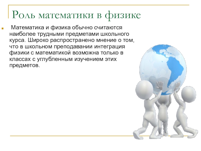 предметами школьного курса. Широко распространено мнение о том, что в школьном преподавании интеграция физики с математикой возможна только в классах с углубленным изучением этих предметов.