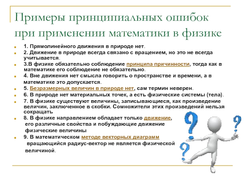 Слайд 8Примеры принципиальных ошибок при применении математики в физике