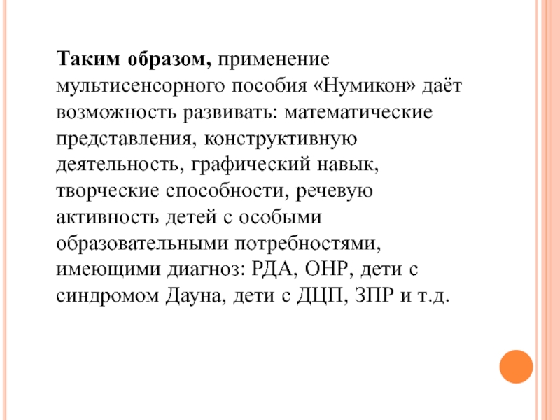 Слайд 12Таким образом, применение мультисенсорного пособия «Нумикон» даёт возможность развивать: математические представления,