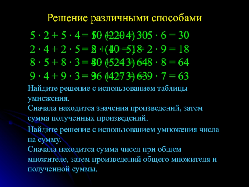 Сначала находится сумма чисел при общем множителе, затем произведений общего множителя и полученной суммы.